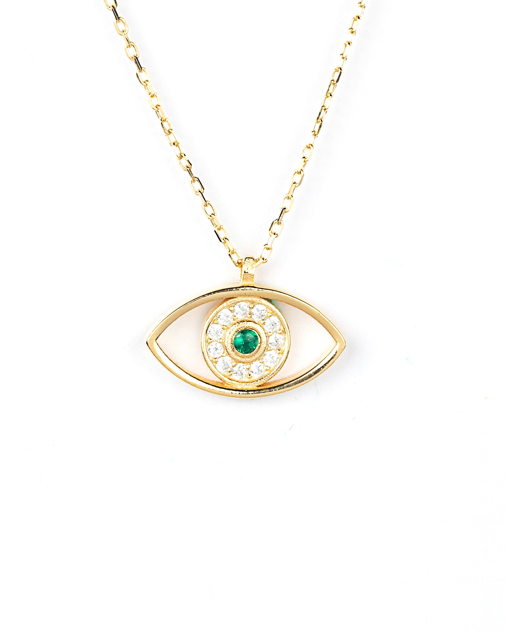 Carry gentle protection and subtle allure with our Evil Eye Pendant—a poetic guardian crafted with elegance and intention. The delicate sparkle of emerald and crystals nestled within luminous gold vermeil softly reminds you of your inner strength and quiet confidence. Let this pendant be your personal talisman, reflecting your journey toward balance, beauty, and serene self-awareness.