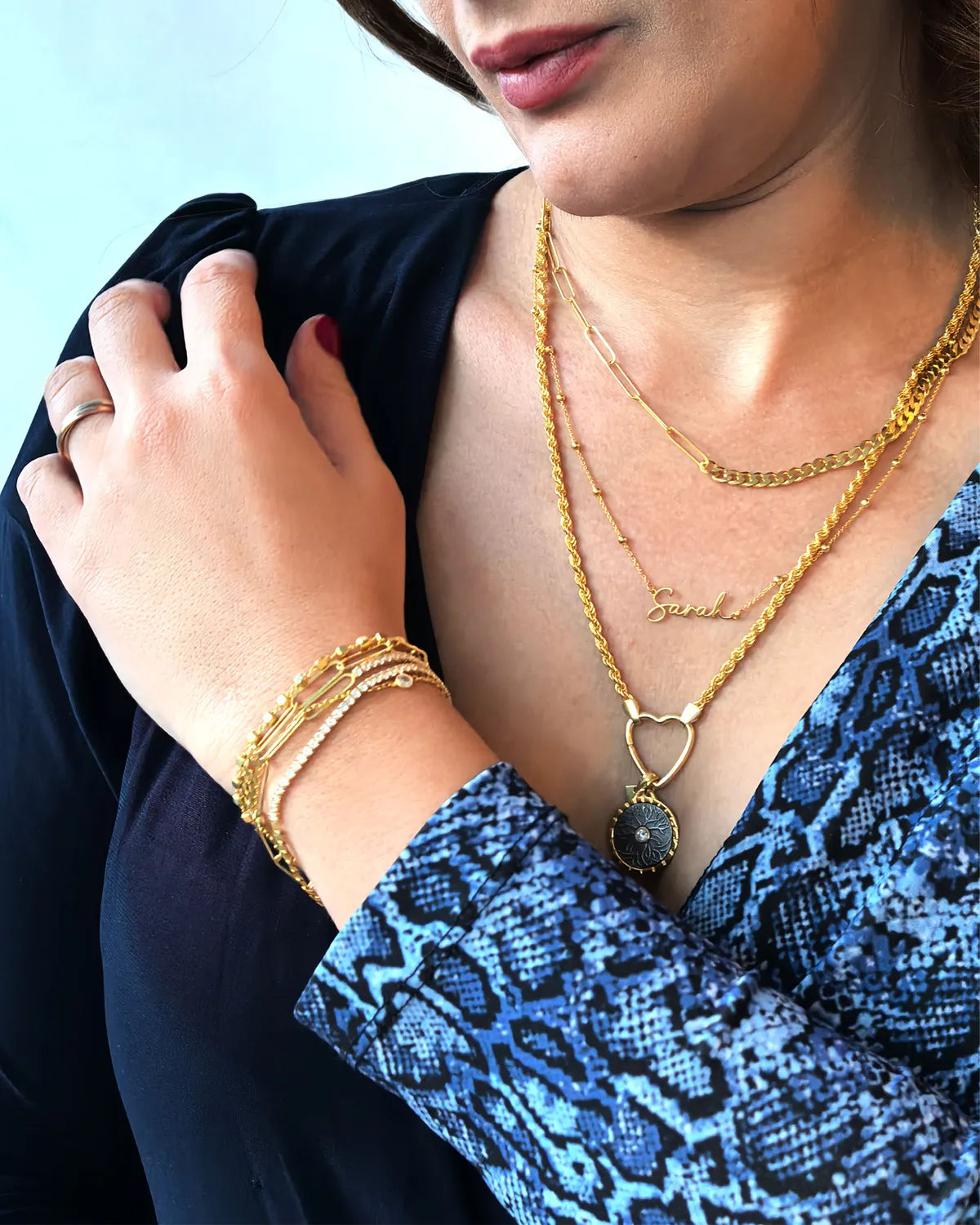 Golden and enduring—our 14K Gold is a blend of rich gold with strength-enhancing alloys, creating the perfect balance of luxury and durability. Its warm, honeyed glow is designed to be cherished for a lifetime, evolving beautifully with every wear. Unlike plated jewelry, this is solid gold through and through, made for everyday elegance.