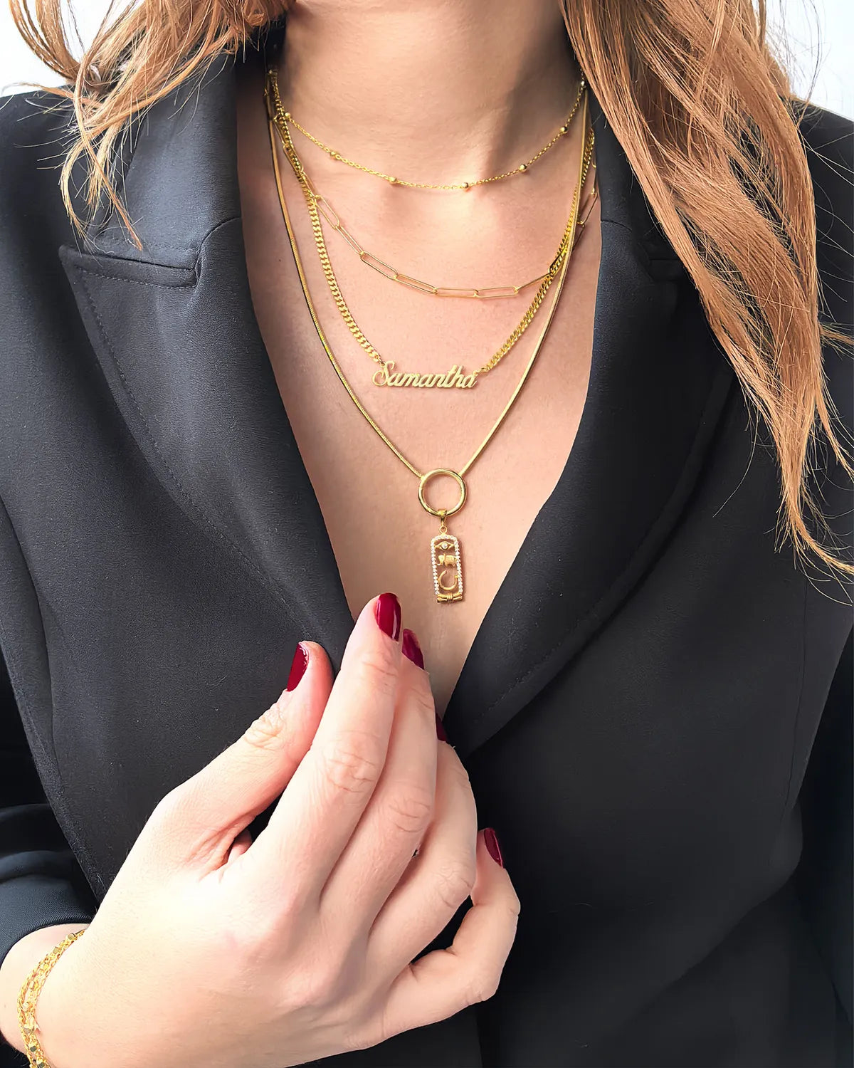 Like a whispered promise, this Gold Vermeil Snake Chain Necklace glides effortlessly along the skin, its fluid form mirroring the movement of light, moments, and memories. At its heart, a round charm holder invites you to tell your story — to carry what matters and make it personal.