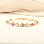 The deep, fiery Aqeeq clovers, rich with grounding energy, intertwine with luminous white stone clovers, evoking serenity and grace. Between them, a delicate row of Moissanite stones glimmers like whispered promises, set within the warmth of solid 14K gold. Designed with a flexible bangle structure, this bracelet moves with you, a quiet reminder that elegance is found in both boldness and softness.