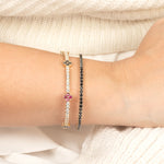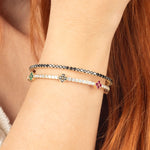 Each vivid clover, from the deep greens of emerald, the fiery warmth of ruby, the midnight glow of onyx, to the celestial blue of sapphire, tells a different story—of strength, passion, wisdom, and resilience. Set against the brilliance of Moissanite stones, this bracelet shimmers with light, mirroring the beauty of contrast and harmony. Wrapped in solid 14K gold with a flexible titanium core, it bends effortlessly, just like the woman who wears it—strong yet graceful, bold yet timeless.