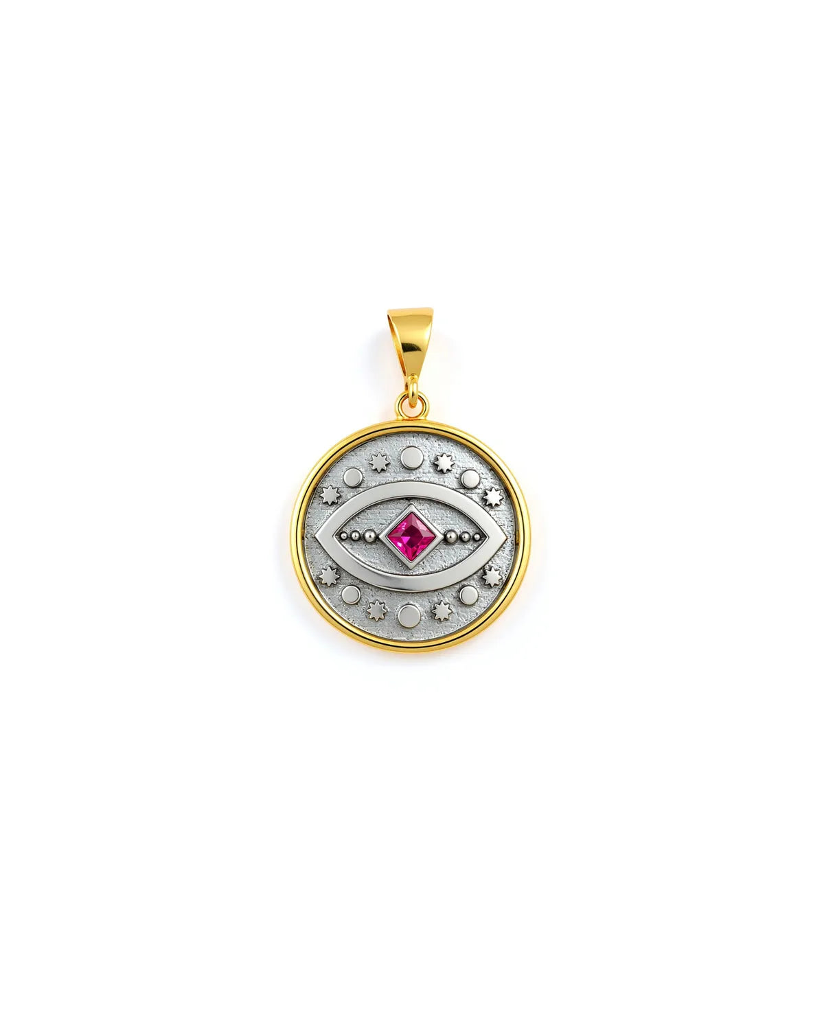 A guardian of mystery, a talisman of intuition—this handcrafted Evil Eye medallion whispers of unseen forces, guiding you toward light and protection. The striking contrast of antiqued silver and radiant gold embodies duality, a balance of strength and serenity. At its heart, a luminous fuchsia gem radiates energy, a symbol of inner fire and fearless beauty. A piece not just to wear, but to feel—timeless, meaningful, yours.