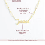 The Jessica Name Necklace is a reflection of confidence and quiet charm. With its flowing script and contemporary paperclip chain, this piece captures the elegance of simplicity and the power of identity. Whether layered with favorites or worn solo, it's a statement of who you are and what you carry close to heart.