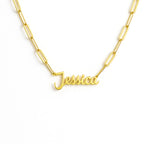 The Jessica Name Necklace is a reflection of confidence and quiet charm. With its flowing script and contemporary paperclip chain, this piece captures the elegance of simplicity and the power of identity. Whether layered with favorites or worn solo, it's a statement of who you are and what you carry close to heart.